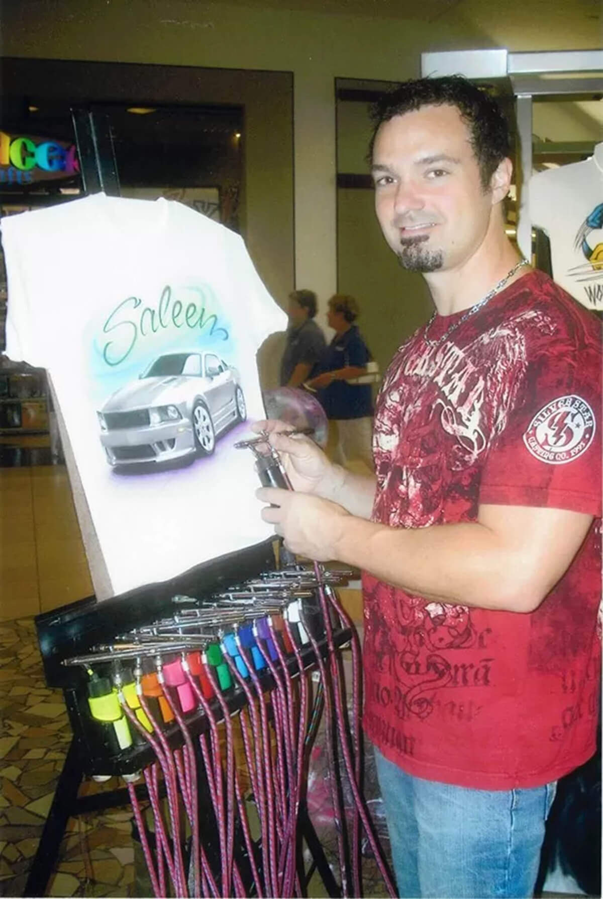Pete’s journey into the realm of t-shirt airbrushing began in a Maine mall when he was just 20 years old. Drawn to the artistry of an airbrush kiosk, Pete’s enthusiasm led him to seek mentorship from the kiosk owner.